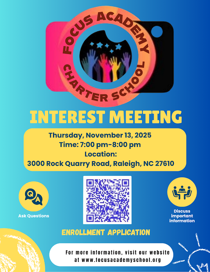Focus Academy Charter School - Opening 2026 - invites families, community members, and supporters to join us for an exciting Interest Meeting and pen Enrollment Kickoff!